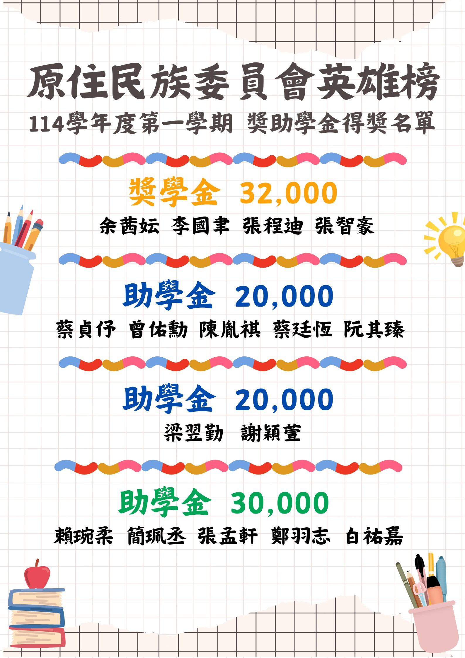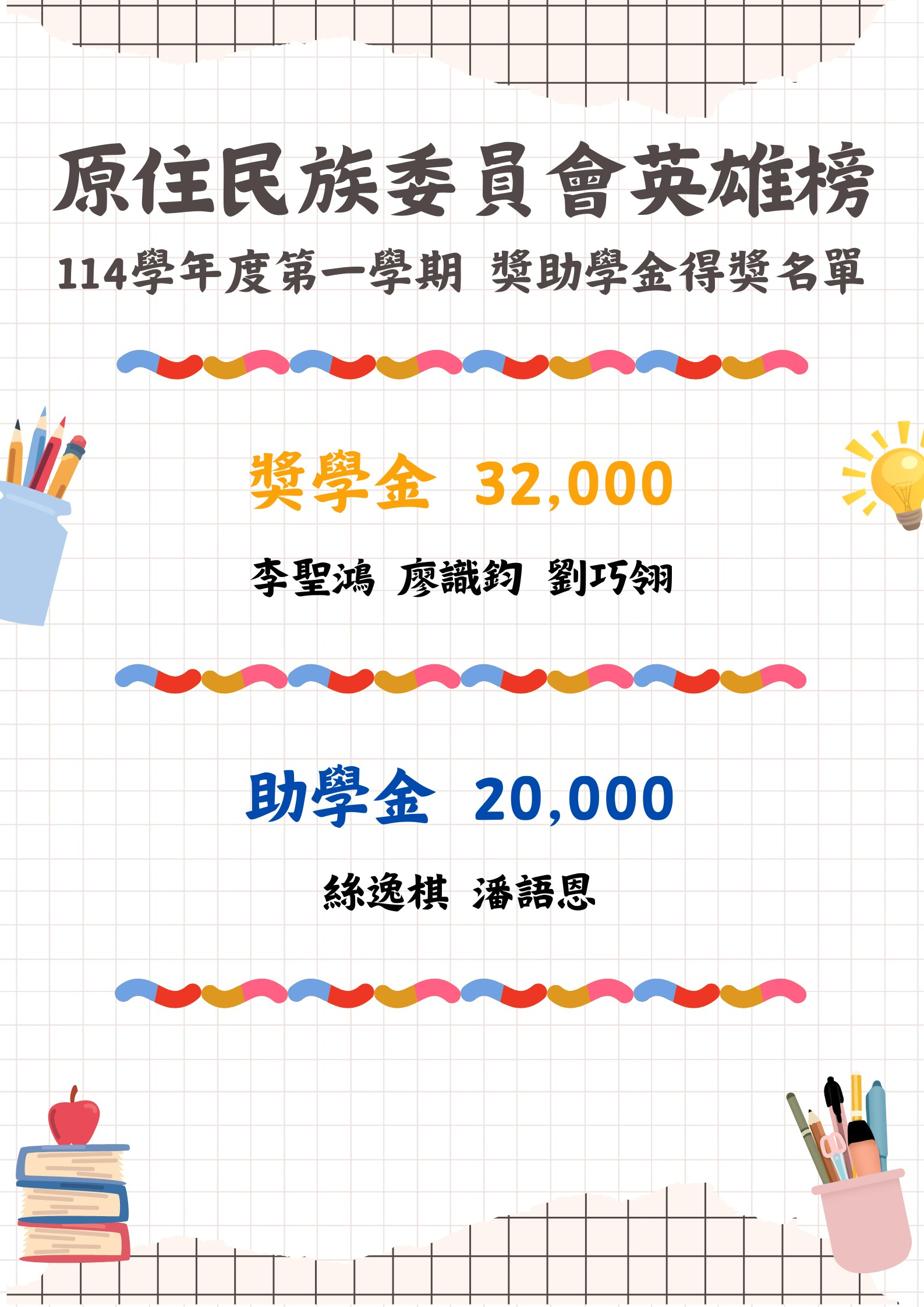【公告】114學年度第1學期大專校院原住民學生獎助學金獲獎名單