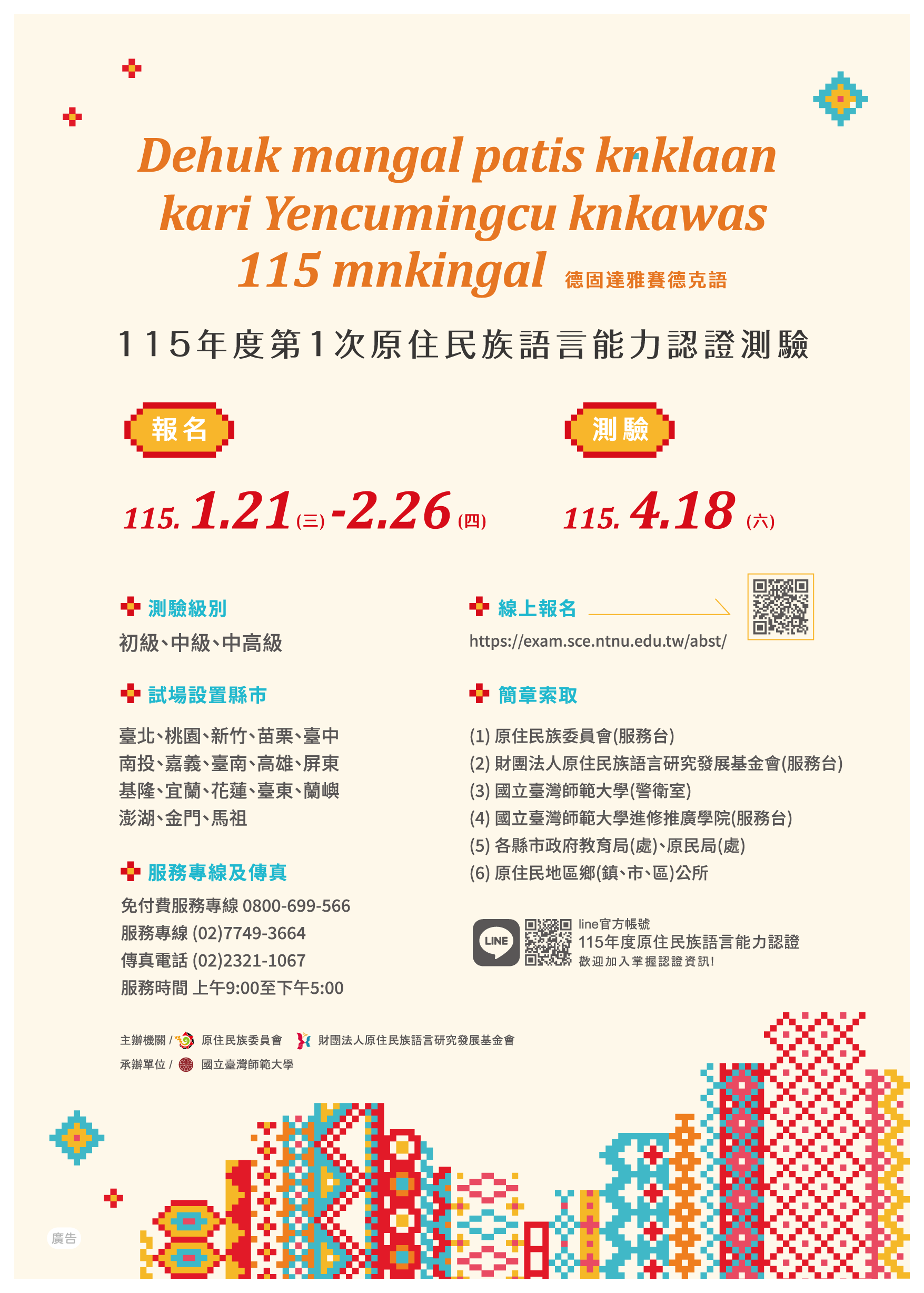 115年度第1次原住民族語言能力認證測驗已正式開放報名!