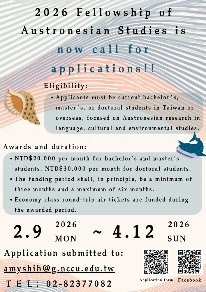 【公告】國立政治大學南島研究講座辦公室「2026年第一梯次南島研究獎學金」開始受理申請!