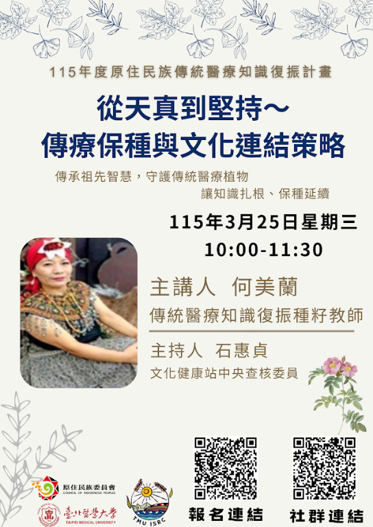 以線上講座方式,邀請原住民族專家學者、文化工作者及部落實務者分享原住民族傳統醫療植物、巫儀文化、靈觀、生態知識及文化照顧等相關議題。